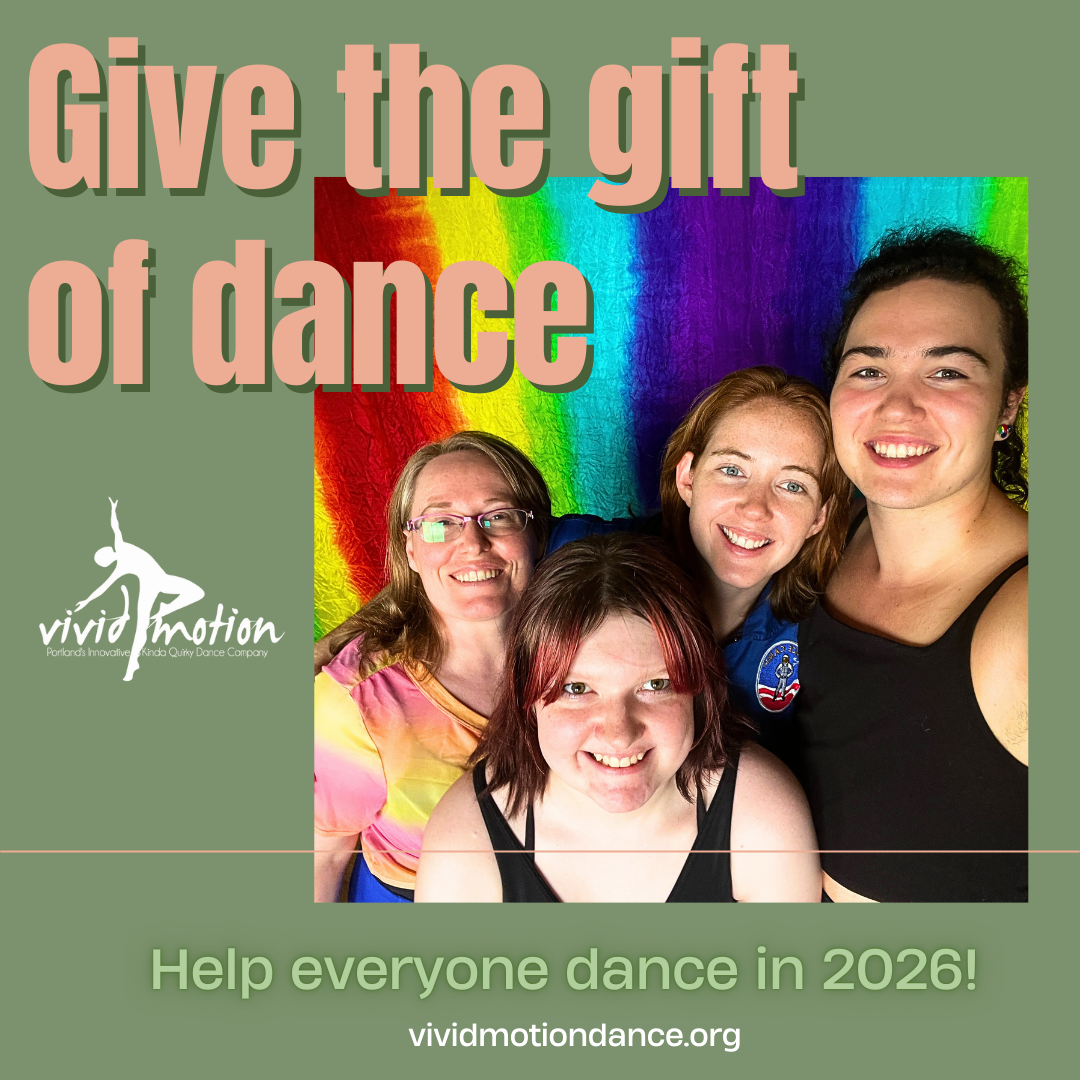 Contributions may be one-time or on-going; focused and specific ("one class session," "costuming," etc) or generalized; one dollar or one thousand. Donations can be sent via Paypal, Venmo, or check mailed to Vivid Motion Dance P.O. Box 1417 Westbrook, ME 04098